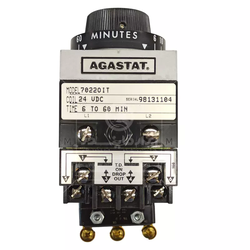 تایمر آگاستات مدل 7022OIT از خانوادهٔ AGASTAT 7000 Series (تایمرهای صنعتی الکترو-پنوماتیک) است. این رله یک تایمرِ تاخیری نوع ON-DELAY با فرم تماس 2 Form C (DPDT)، معمولاً با میل کویل 24VDC و بازهٔ زمانی 6 تا 60 دقیقه می باشد. این خانواده از تایمرها از یک سرِ تایم الکترو-پنوماتیک استفاده میکند، وقتی کویل تغذیه میشود، هوای محبوس از مسیر تنظیمشوندهای عبور میکند و با تغییر مسیر/مقاومت جریان هوا زمان تاخیر خطی یا شبهخطی ایجاد میشود. این طراحی باعث دقت خوب و پایداری در شرایط صنعتی میشود. مدل 7022OIT بهصورت ON-DELAY عمل میکند، یعنی با اعمال ولتاژ فرمان، شمارش زمان شروع میشود و پس از سپری شدن زمان تنظیمشده، کنتاکت ها تغییر وضعیت میدهند. از موارد استفاده این مدل تایمر می توان به کنترل استارت/وقف موتورها و پمپها (تاخیر راهاندازی)، کنترل توالی در ماشینآلات صنعتی (دو-مرحلهای)، محافظت و کنترل مدارهای فرمان در تابلوهای صنعتی و کاربردهای HVAC، خط تولید، تجهیزات بستهبندی و آزمایشگاهی اشاره کرد.