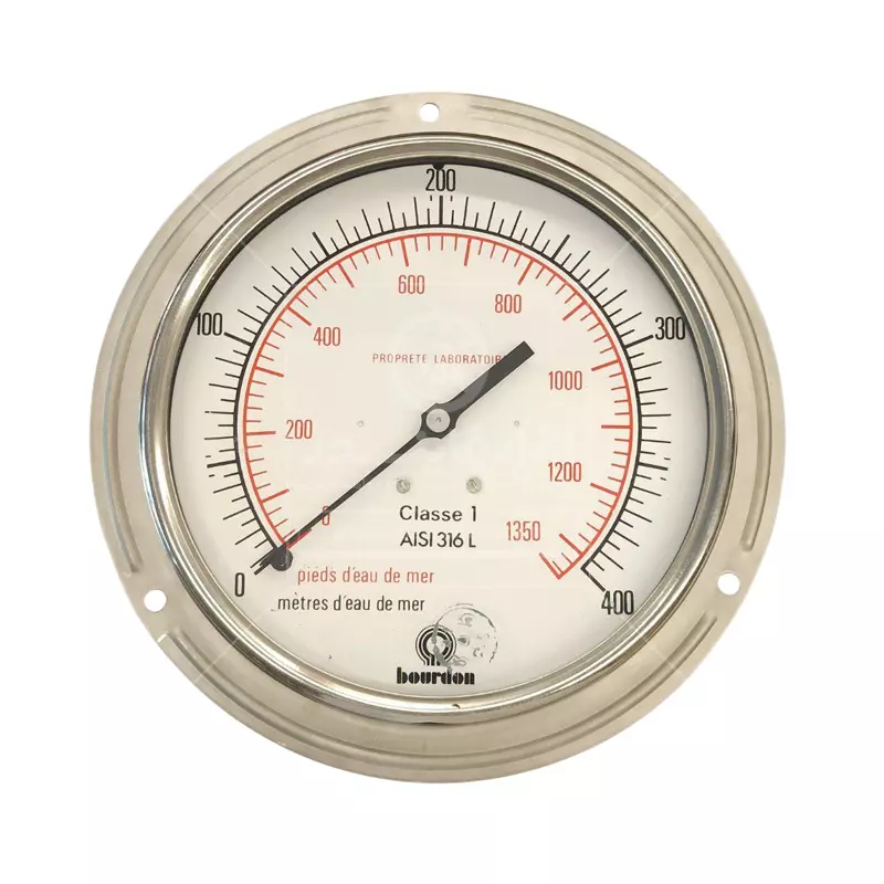 گیج فشار صفحه ۱۶ سانت برند بوردون یک ابزار اندازهگیری مکانیکی است که برای نمایش فشار سیالات (مایعات یا گازها) در سیستمهای صنعتی به کار میرود. این وسیله، یک گیج فشار (Manometer) برند Bourdon است که برای اندازهگیری فشار هیدرواستاتیک (متر آب دریا یا feet of seawater) طراحی شده است. این مدل برای محیط هایی که نیاز به اندازهگیری فشار در واحد عمق آب (Water Column) دارند استفاده می شود.