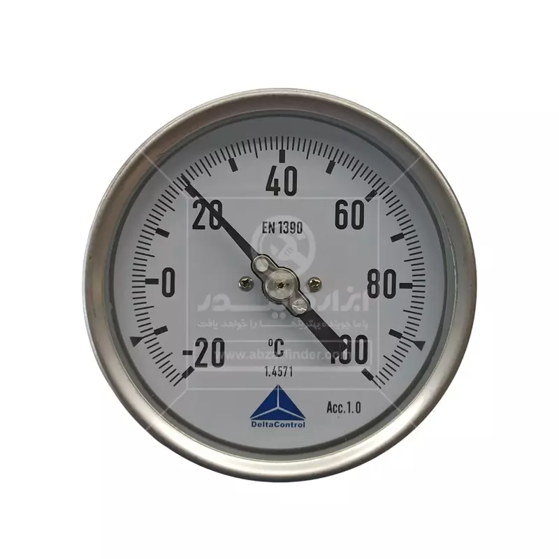 ترمومتر تاشو صفحه 10 سانت دلتا کنترل با طول سنسور 300 میلی متر یک دماسنج عقربهای صنعتی با ساقه فلزی قابل تنظیم است که برای اندازهگیری دمای سیالات (مایعات و گازها) در کاربردهای صنعتی، تأسیساتی و فرآیندی طراحی شده است. این مدلها برای اندازهگیری دمای سیالات صنعتی (مثل آب، بخار کمفشار، روغن، هوا/گازها و …) طراحی میشوند، جاهایی که برق و باتری نمیخواهید یا ندارید، ابزار باید ساده، مقاوم و همیشهکار باشد و یا خواندن دما از روی عقربه و صفحه کافی باشد. داخل دستگاه از فنر بیمتال مارپیچی استفاده شده است، با تغییر دما، بیمتال منبسط یا منقبض شده و باعث حرکت عقربه میشود، در واقع بدون نیاز به برق، دما را مستقیم و قابلاعتماد نشان میدهد. این مکانیزم بسیار بادوام است و نیاز به کالیبراسیون مداوم ندارد. این ترمومتر چون مکانیکی است، بهاندازهی سنسور دیجیتالِ کالیبرهشده “فوقدقیق” نیست، اما برای کنترلهای صنعتی عالی است. عبارت EN 1390 روی صفحه یعنی مطابق استاندارد اروپایی مربوط به ترمومترهای بیمتال/صفحهای می باشد.