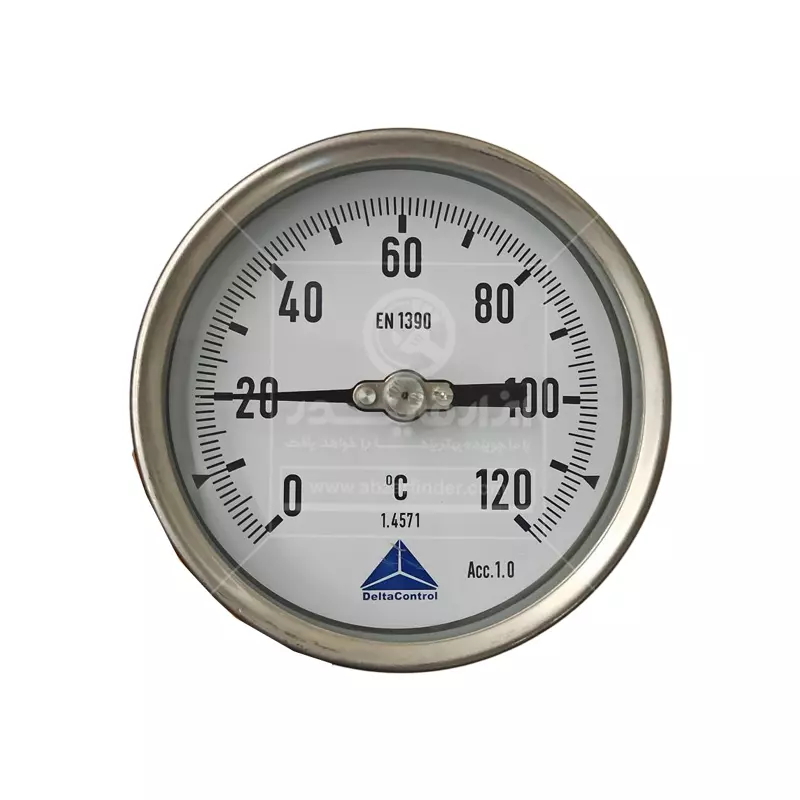 ترمومتر تاشو صفحه 10 سانت دلتا کنترل رنج 120 درجه سانتی گراد و طول 400 میلی متر یک دماسنج عقربهای صنعتی با ساقه فلزی قابل تنظیم است که برای اندازهگیری دمای سیالات (مایعات و گازها) در کاربردهای صنعتی، تأسیساتی و فرآیندی طراحی شده است. این مدلها برای اندازهگیری دمای سیالات صنعتی (مثل آب، بخار کمفشار، روغن، هوا/گازها و …) طراحی میشوند، جاهایی که برق و باتری نمیخواهید یا ندارید، ابزار باید ساده، مقاوم و همیشهکار باشد و یا خواندن دما از روی عقربه و صفحه کافی باشد. داخل دستگاه از فنر بیمتال مارپیچی استفاده شده است، با تغییر دما، بیمتال منبسط یا منقبض شده و باعث حرکت عقربه میشود، در واقع بدون نیاز به برق، دما را مستقیم و قابلاعتماد نشان میدهد. این مکانیزم بسیار بادوام است و نیاز به کالیبراسیون مداوم ندارد. این ترمومتر چون مکانیکی است، بهاندازهی سنسور دیجیتالِ کالیبرهشده “فوقدقیق” نیست، اما برای کنترلهای صنعتی عالی است. عبارت EN 1390 روی صفحه یعنی مطابق استاندارد اروپایی مربوط به ترمومترهای بیمتال/صفحهای می باشد.