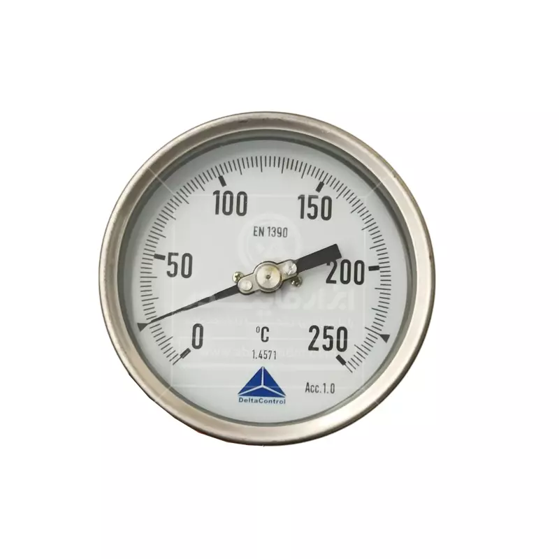 ترمومتر تاشو صفحه 10 سانت دلتا کنترل رنج 250 درجه سانتی گراد و طول 400 میلی متر یک دماسنج عقربهای صنعتی با ساقه فلزی قابل تنظیم است که برای اندازهگیری دمای سیالات (مایعات و گازها) در کاربردهای صنعتی، تأسیساتی و فرآیندی طراحی شده است. این مدلها برای اندازهگیری دمای سیالات صنعتی (مثل آب، بخار کمفشار، روغن، هوا/گازها و …) طراحی میشوند، جاهایی که برق و باتری نمیخواهید یا ندارید، ابزار باید ساده، مقاوم و همیشهکار باشد و یا خواندن دما از روی عقربه و صفحه کافی باشد. داخل دستگاه از فنر بیمتال مارپیچی استفاده شده است، با تغییر دما، بیمتال منبسط یا منقبض شده و باعث حرکت عقربه میشود، در واقع بدون نیاز به برق، دما را مستقیم و قابلاعتماد نشان میدهد. این مکانیزم بسیار بادوام است و نیاز به کالیبراسیون مداوم ندارد. این ترمومتر چون مکانیکی است، بهاندازهی سنسور دیجیتالِ کالیبرهشده “فوقدقیق” نیست، اما برای کنترلهای صنعتی عالی است. عبارت EN 1390 روی صفحه یعنی مطابق استاندارد اروپایی مربوط به ترمومترهای بیمتال/صفحهای می باشد.