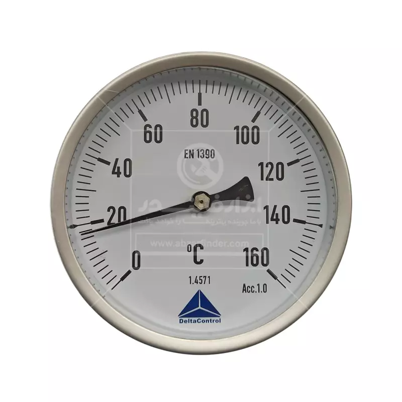 ترمومتر اتصال از پشت دلتا کنترل رنج 160 درجه سانتیگراد و طول 160 میلی متر یک ترمومتر عقربهای صنعتی با اتصال از پشت (Centre Back Stem) است، یعنی صفحهی گردِ نمایش از جلو دیده میشود، اما میله/سنسور از پشتِ بدنه وارد خط یا مخزن میشود. این مدلها برای اندازهگیری دمای سیالات صنعتی (مثل آب، بخار کمفشار، روغن، هوا/گازها و …) طراحی میشوند، جاهایی که برق و باتری نمیخواهید یا ندارید، ابزار باید ساده، مقاوم و همیشهکار باشد و یا خواندن دما از روی عقربه و صفحه کافی باشد. ویژگی کلیدی نسخهی «اتصال از پشت» این است که وقتی ترمومتر روی دیوار مخزن یا روی لوله از روبهرو نصب میشود، صفحه درست رو به اپراتور میایستد و میله از پشت وارد سیستم میشود. این ترمومتر معمولاً از نوع بیمتال (Bimetal) است. داخل بدنه یک قطعهی فلزی از دو فلز متفاوت وجود دارد که به هم چسبیدهاند، وقتی دما بالا/پایین میرود، هر فلز با نرخ متفاوتی منبسط/منقبض میشود، این اختلاف انبساط باعث پیچش یا حرکت مکانیکی آن قطعه میشود و در نهایت این حرکت با یک مکانیزم انتقال (چرخدنده/اهرم) به عقربه میرسد و عقربه روی صفحه عدد دما را نشان میدهد، در واقع بدون نیاز به برق، دما را مستقیم و قابلاعتماد نشان میدهد. این ترمومتر چون مکانیکی است، بهاندازهی سنسور دیجیتالِ کالیبرهشده “فوقدقیق” نیست، اما برای کنترلهای صنعتی عالی است. عبارت EN 1390 روی صفحه یعنی مطابق استاندارد اروپایی مربوط به ترمومترهای بیمتال/صفحهای می باشد.