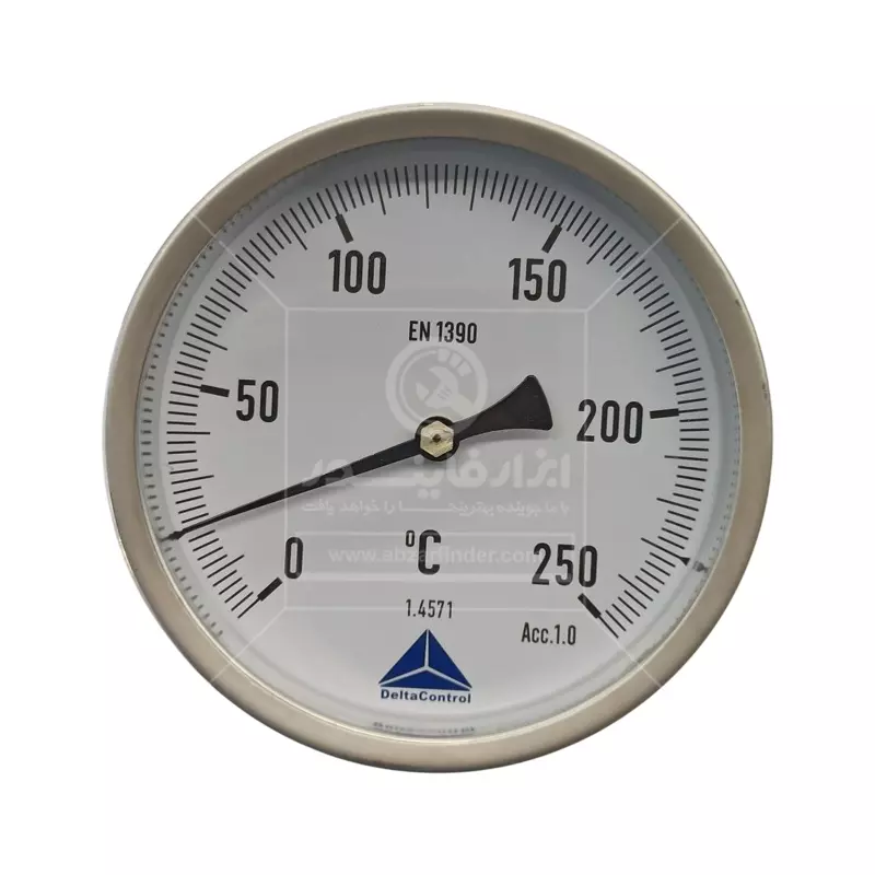 ترمومتر اتصال از پشت دلتا کنترل رنج 250 درجه سانتیگراد و طول 250 میلی متر یک ترمومتر عقربهای صنعتی با اتصال از پشت (Centre Back Stem) است، یعنی صفحهی گردِ نمایش از جلو دیده میشود، اما میله/سنسور از پشتِ بدنه وارد خط یا مخزن میشود. این مدلها برای اندازهگیری دمای سیالات صنعتی (مثل آب، بخار کمفشار، روغن، هوا/گازها و …) طراحی میشوند، جاهایی که برق و باتری نمیخواهید یا ندارید، ابزار باید ساده، مقاوم و همیشهکار باشد و یا خواندن دما از روی عقربه و صفحه کافی باشد. ویژگی کلیدی نسخهی «اتصال از پشت» این است که وقتی ترمومتر روی دیوار مخزن یا روی لوله از روبهرو نصب میشود، صفحه درست رو به اپراتور میایستد و میله از پشت وارد سیستم میشود. این ترمومتر معمولاً از نوع بیمتال (Bimetal) است. داخل بدنه یک قطعهی فلزی از دو فلز متفاوت وجود دارد که به هم چسبیدهاند، وقتی دما بالا/پایین میرود، هر فلز با نرخ متفاوتی منبسط/منقبض میشود، این اختلاف انبساط باعث پیچش یا حرکت مکانیکی آن قطعه میشود و در نهایت این حرکت با یک مکانیزم انتقال (چرخدنده/اهرم) به عقربه میرسد و عقربه روی صفحه عدد دما را نشان میدهد، در واقع بدون نیاز به برق، دما را مستقیم و قابلاعتماد نشان میدهد. این ترمومتر چون مکانیکی است، بهاندازهی سنسور دیجیتالِ کالیبرهشده “فوقدقیق” نیست، اما برای کنترلهای صنعتی عالی است. عبارت EN 1390 روی صفحه یعنی مطابق استاندارد اروپایی مربوط به ترمومترهای بیمتال/صفحهای می باشد.