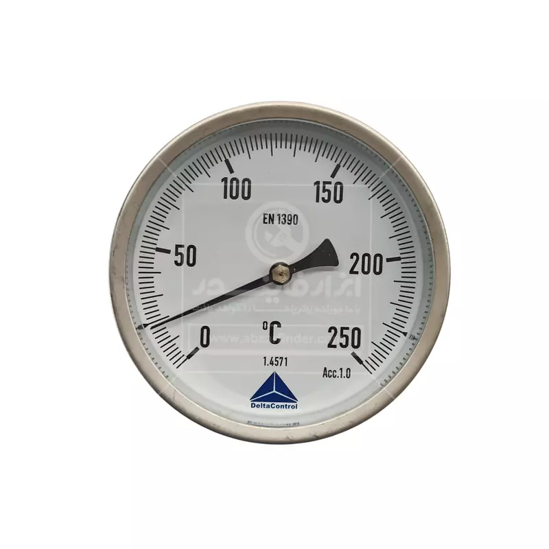 ترمومتر اتصال از پشت دلتا کنترل رنج  250 درجه سانتیگراد  و طول 400 میلی متر یک ترمومتر عقربه‌ای صنعتی با اتصال از پشت (Centre Back Stem) است، یعنی صفحه‌ی گردِ نمایش از جلو دیده می‌شود، اما میله/سنسور از پشتِ بدنه وارد خط یا مخزن می‌شود. این مدل‌ها برای اندازه‌گیری دمای سیالات صنعتی (مثل آب، بخار کم‌فشار، روغن، هوا/گازها و …) طراحی می‌شوند، جاهایی که برق و باتری نمی‌خواهید یا ندارید، ابزار باید ساده، مقاوم و همیشه‌کار باشد و یا خواندن دما از روی عقربه و صفحه کافی باشد. ویژگی کلیدی نسخه‌ی «اتصال از پشت» این است که وقتی ترمومتر روی دیوار مخزن یا روی لوله از روبه‌رو نصب می‌شود، صفحه درست رو به اپراتور می‌ایستد و میله از پشت وارد سیستم می‌شود. این ترمومتر معمولاً از نوع بی‌متال (Bimetal) است. داخل بدنه یک قطعه‌ی فلزی از دو فلز متفاوت وجود دارد که به هم چسبیده‌اند، وقتی دما بالا/پایین می‌رود، هر فلز با نرخ متفاوتی منبسط/منقبض می‌شود، این اختلاف انبساط باعث پیچش یا حرکت مکانیکی آن قطعه می‌شود و در نهایت این حرکت با یک مکانیزم انتقال (چرخ‌دنده/اهرم) به عقربه می‌رسد و عقربه روی صفحه عدد دما را نشان می‌دهد، در واقع بدون نیاز به برق، دما را مستقیم و قابل‌اعتماد نشان می‌دهد. این ترمومتر چون مکانیکی است، به‌اندازه‌ی سنسور دیجیتالِ کالیبره‌شده “فوق‌دقیق” نیست، اما برای کنترل‌های صنعتی عالی است. عبارت EN 1390 روی صفحه یعنی مطابق استاندارد اروپایی مربوط به ترمومترهای بی‌متال/صفحه‌ای می باشد.
