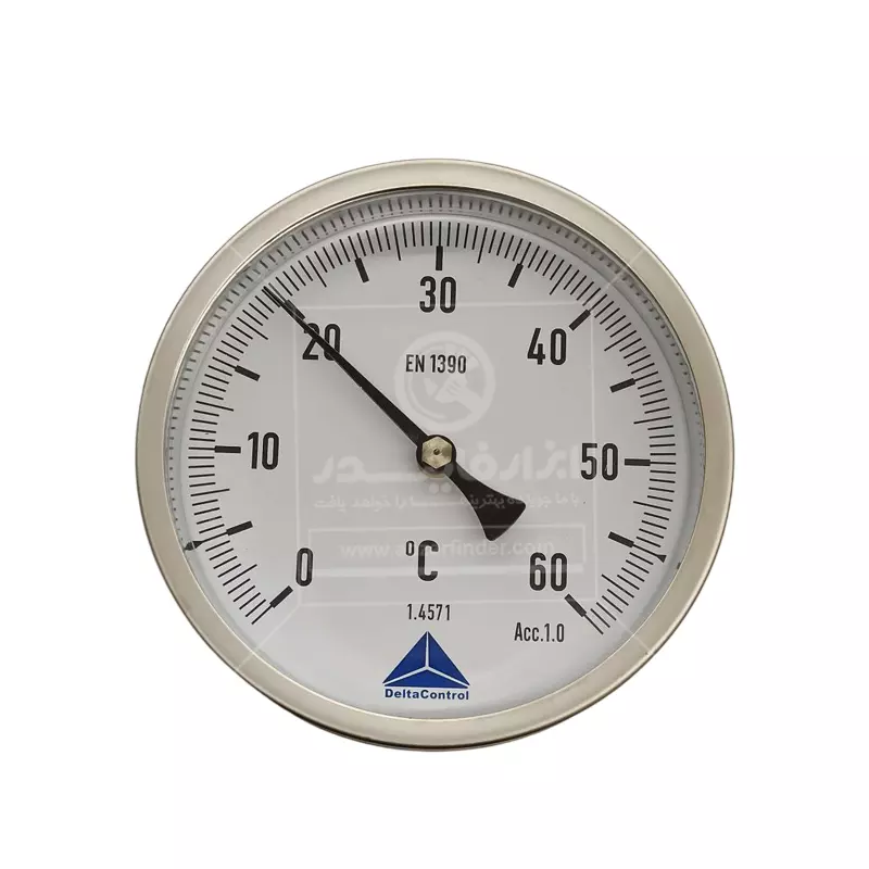 ترمومتر صفحه 10 سانت دلتا کنترل رنج 60 درجه سانتیگراد و طول 100 میلی متر یک ترمومتر عقربهای صنعتی با اتصال از پشت (Centre Back Stem) است، یعنی صفحهی گردِ نمایش از جلو دیده میشود، اما میله/سنسور از پشتِ بدنه وارد خط یا مخزن میشود. این مدلها برای اندازهگیری دمای سیالات صنعتی (مثل آب، بخار کمفشار، روغن، هوا/گازها و …) طراحی میشوند، جاهایی که برق و باتری نمیخواهید یا ندارید، ابزار باید ساده، مقاوم و همیشهکار باشد و یا خواندن دما از روی عقربه و صفحه کافی باشد. ویژگی کلیدی نسخهی «اتصال از پشت» این است که وقتی ترمومتر روی دیوار مخزن یا روی لوله از روبهرو نصب میشود، صفحه درست رو به اپراتور میایستد و میله از پشت وارد سیستم میشود. این ترمومتر معمولاً از نوع بیمتال (Bimetal) است. داخل بدنه یک قطعهی فلزی از دو فلز متفاوت وجود دارد که به هم چسبیدهاند، وقتی دما بالا/پایین میرود، هر فلز با نرخ متفاوتی منبسط/منقبض میشود، این اختلاف انبساط باعث پیچش یا حرکت مکانیکی آن قطعه میشود و در نهایت این حرکت با یک مکانیزم انتقال (چرخدنده/اهرم) به عقربه میرسد و عقربه روی صفحه عدد دما را نشان میدهد، در واقع بدون نیاز به برق، دما را مستقیم و قابلاعتماد نشان میدهد. این ترمومتر چون مکانیکی است، بهاندازهی سنسور دیجیتالِ کالیبرهشده “فوقدقیق” نیست، اما برای کنترلهای صنعتی عالی است. عبارت EN 1390 روی صفحه یعنی مطابق استاندارد اروپایی مربوط به ترمومترهای بیمتال/صفحهای می باشد.
