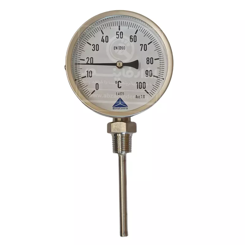 ترمومتر صفحه 10 سانت دلتا کنترل رنج 100 درجه سانتیگراد و طول 100 میلی متر یک ترمومتر عقربهای صنعتی با اتصال از زیر است. این مدلها برای اندازهگیری دمای سیالات صنعتی (مثل آب، بخار کمفشار، روغن، هوا/گازها و …) طراحی میشوند، جاهایی که برق و باتری نمیخواهید یا ندارید، ابزار باید ساده، مقاوم و همیشهکار باشد و یا خواندن دما از روی عقربه و صفحه کافی باشد. این ترمومتر معمولاً از نوع بیمتال (Bimetal) است. داخل بدنه یک قطعهی فلزی از دو فلز متفاوت وجود دارد که به هم چسبیدهاند، وقتی دما بالا/پایین میرود، هر فلز با نرخ متفاوتی منبسط/منقبض میشود، این اختلاف انبساط باعث پیچش یا حرکت مکانیکی آن قطعه میشود و در نهایت این حرکت با یک مکانیزم انتقال (چرخدنده/اهرم) به عقربه میرسد و عقربه روی صفحه عدد دما را نشان میدهد، در واقع بدون نیاز به برق، دما را مستقیم و قابلاعتماد نشان میدهد. این ترمومتر چون مکانیکی است، بهاندازهی سنسور دیجیتالِ کالیبرهشده “فوقدقیق” نیست، اما برای کنترلهای صنعتی عالی است. عبارت EN 1390 روی صفحه یعنی مطابق استاندارد اروپایی مربوط به ترمومترهای بیمتال/صفحهای می باشد.