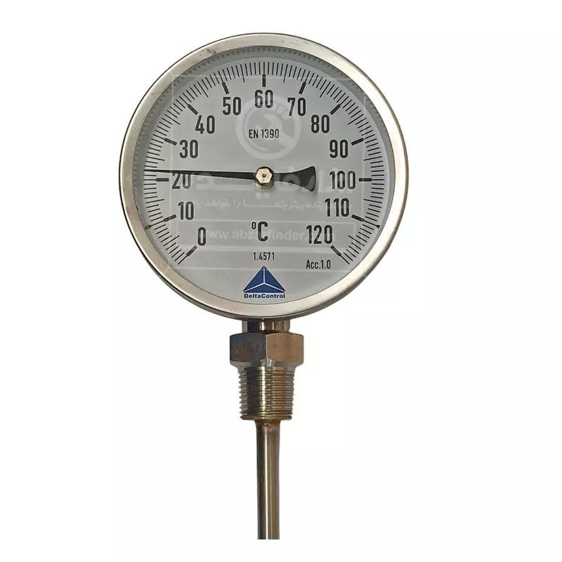 ترمومتر صفحه 10 سانت دلتا کنترل رنج 120 درجه سانتیگراد و طول 200 میلی متر یک ترمومتر عقربهای صنعتی با اتصال از زیر است. این مدلها برای اندازهگیری دمای سیالات صنعتی (مثل آب، بخار کمفشار، روغن، هوا/گازها و …) طراحی میشوند، جاهایی که برق و باتری نمیخواهید یا ندارید، ابزار باید ساده، مقاوم و همیشهکار باشد و یا خواندن دما از روی عقربه و صفحه کافی باشد. این ترمومتر معمولاً از نوع بیمتال (Bimetal) است. داخل بدنه یک قطعهی فلزی از دو فلز متفاوت وجود دارد که به هم چسبیدهاند، وقتی دما بالا/پایین میرود، هر فلز با نرخ متفاوتی منبسط/منقبض میشود، این اختلاف انبساط باعث پیچش یا حرکت مکانیکی آن قطعه میشود و در نهایت این حرکت با یک مکانیزم انتقال (چرخدنده/اهرم) به عقربه میرسد و عقربه روی صفحه عدد دما را نشان میدهد، در واقع بدون نیاز به برق، دما را مستقیم و قابلاعتماد نشان میدهد. این ترمومتر چون مکانیکی است، بهاندازهی سنسور دیجیتالِ کالیبرهشده “فوقدقیق” نیست، اما برای کنترلهای صنعتی عالی است. عبارت EN 1390 روی صفحه یعنی مطابق استاندارد اروپایی مربوط به ترمومترهای بیمتال/صفحهای می باشد.
