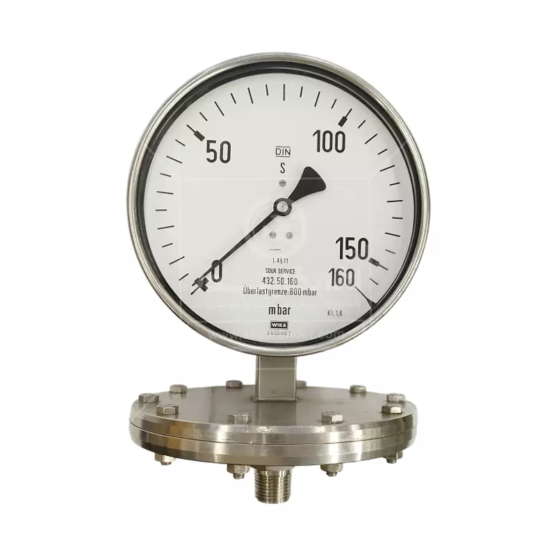 گیج فشار دیافراگمی صفحه 16 سانت ویکا مدل 432.50.160 یک گیج فشار دیافراگمی است. سیال فرآیندی روی دیافراگم وارد فشار میشود و دیافراگم خم شده و این تغییر مکان از طریق مکانیزم انتقال حرکت به عقربه منتقل میشود. این طراحی برای فشارهای بسیار پایین (مثل mbar) و سیالات خورنده یا حاوی ذرات معلق مناسب است.به دلیل طراحی دیافراگمی، برای سیالاتی که ممکن است شامل ذرات، ویسکوزیته بالا، رسوبگذاری یا خورندگی باشند، نسبت به گیجهای بوردونی مناسبتر است. در مواردی که فشار وارد شده نوسانی باشد یا ارتعاش زیاد باشد، توصیه میشود از نسخههای پر شده با مایع (مثلاً گلیسرین) استفاده شود.