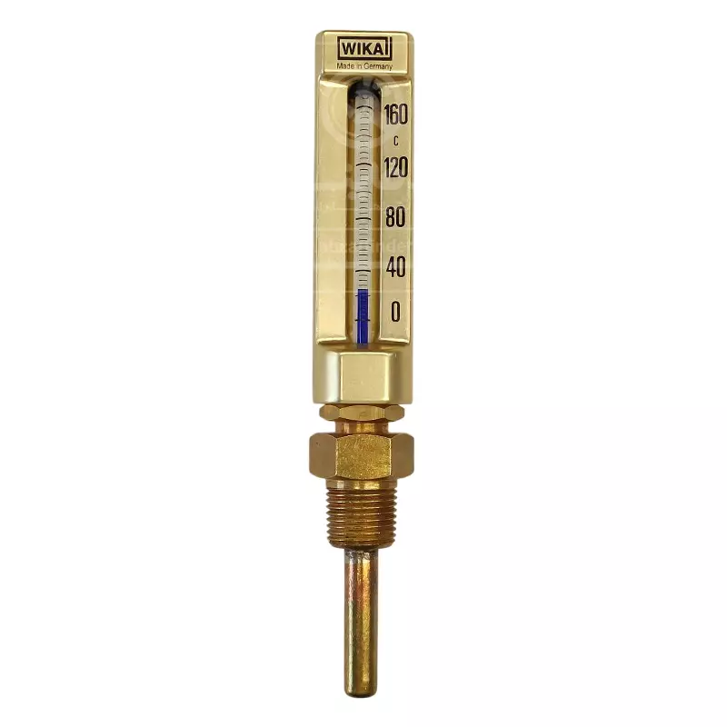 ترمومتر الکلی 0 تا 160 درجه ویکا مدل TM32-L6CM در حقیقت همان نوع جیوه ایست که این بار الکل به جای جیوه قرار گرفته است و در مقابل نوع جیوه ای، به خاطر استفاده از الکل خطر کمتری دارد. در واقع این قطعه یک ترمومتر صنعتی مایع‌درون‌شیشه (liquid-in-glass) یا ترمومتر غوطه‌رو با بدنه برنجی است که توسط برند آلمانی WIKA عرضه می‌شود. محدودهٔ نشان‌دادۀ آن در عکس از 0 تا 160 درجهٔ سانتی‌گراد است و ستون مایع رنگی (آبی) تغییر ارتفاع می‌دهد تا دمای محیط یا سیال را نشان دهد. طراحی و اتصال رزوه‌ای پایینی نشان می‌دهد برای نصب در فرآیند (مثلاً درون محفظه، روی خط لوله یا روی بدنهٔ مخزن/دستگاه) در نظر گرفته شده است. ترمومترهای سادهٔ مایع‌درون‌شیشه معمولاً پایدارند، اما برای کاربردهای حساس بهتر است به‌صورت دوره‌ای با استاندارد (حمام آب دمای کنترل‌شده یا مقایسه با ترمومتر مرجع) بررسی شوند و در صورت شکستگی لولهٔ شیشه‌ای یا ناپایداری ستون مایع، ترمومتر باید تعویض شود.