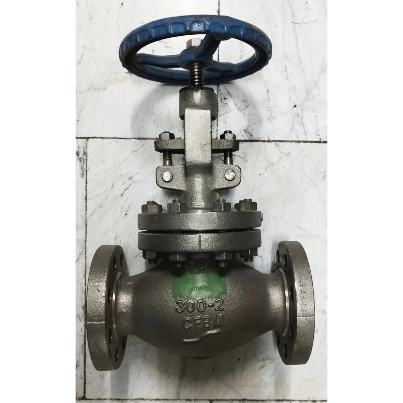 شیر گلوب XOMOX مدل WE21 یک شیر گلوب (Globe Valve) فلنجی است که برای کنترل و تنظیم جریان در خطوط فرایندی استفاده میشود. طراحی کرویشکل بدنه باعث میشود سیال هنگام عبور تغییر مسیر داده و امکان تنظیم دقیقتری نسبت به شیرهای دروازهای فراهم شود. باز و بسته شدن شیر از طریق حرکت عمودی دیسک روی نشیمنگاه انجام میگیرد که توسط چرخدستی آبیرنگ در بالای شیر کنترل میشود. بر روی بدنه علامت CF8M حک شده است که نشاندهنده جنس بدنه از استنلس استیل 316 مطابق استاندارد ASTM A351 است. این آلیاژ مقاومت بسیار خوبی در برابر خوردگی، رطوبت، مواد شیمیایی و شرایط محیطی سخت دارد، بنابراین برای صنایع نفت، گاز، پتروشیمی و فرآیندهای خورنده بسیار مناسب است. علامت 300-2 نیز نشان میدهد شیر در کلاس فشاری ANSI Class 300 طراحی شده و توان تحمل فشارهای متوسط تا بالا را داراست.